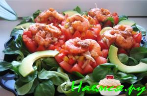 Наполнить половинки кожицы авокадо овощной смесью,сверху воткнуть по креветке.