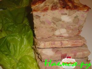 Теперь берем большую кастрюлю или гусятницу и ставим в нее террин, наливаем в кастрюлю воды, примерно до половины формы и ставим в духовку. Запекаем при 180 градусах около часа (следите за тем, чтобы не выкипела вся вода). Примерно за десять мнут до окончания выпекания снять фольгу и дать поверхности террина немного зарумяниться.