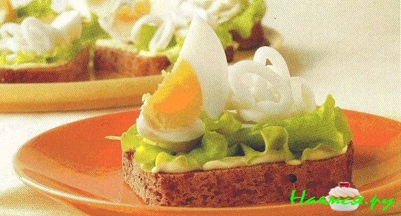 2) Ломтики хлеба смажьте майонезом, положите по половине листа салата, затем – нарезанных кальмаров и по дольке яйца