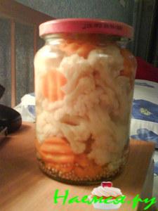 Слегка мнем капусту с морковкой. После добавляем измельченного чеснока, складываем вместе в банки и заливаем приготовленным рассолом. Стерилизуем в течение получаса и закручиваем.